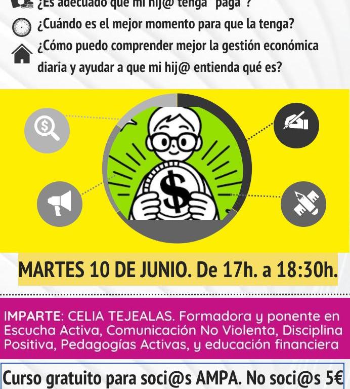 Nos complace anunciar el último taller de formación del curso: «LA EDUCACIÓN FINANCIERA TAMBIÉN ES IMPORTANTE», de la mano de Celia Tejealas.