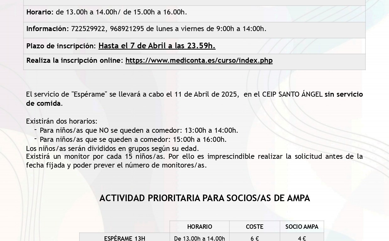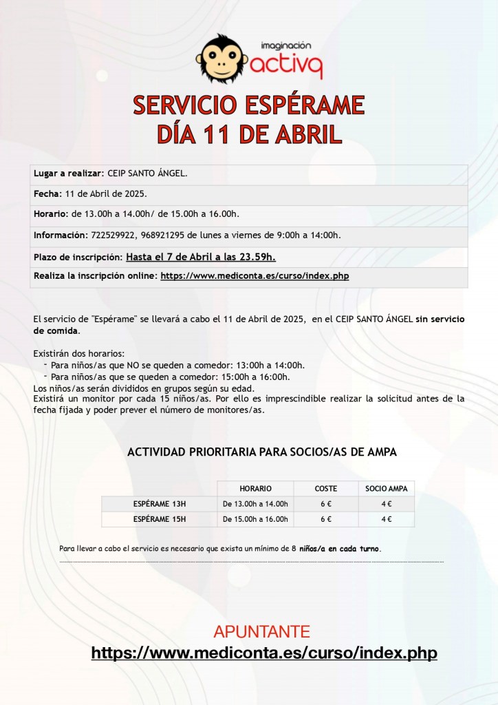 Este viernes 11 de abril ofrecemos el servicio de «Espérame» para aquellas familias que lo necesiten en dos horarios: